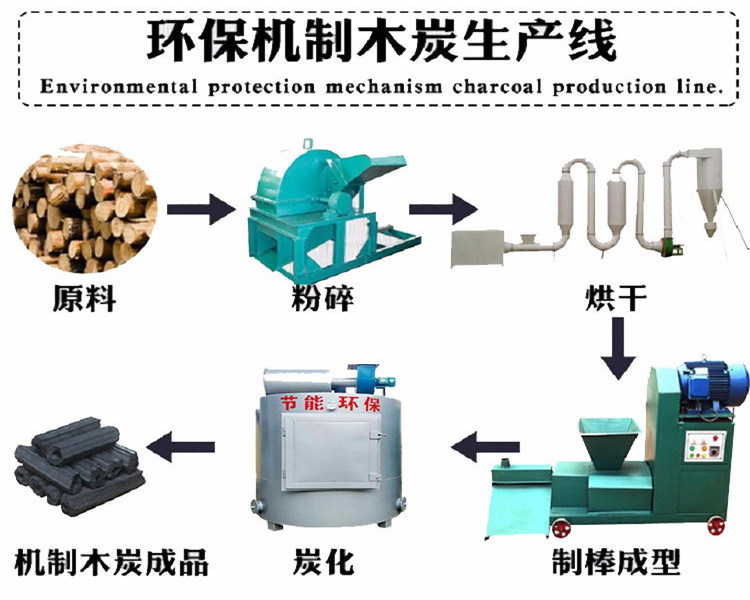 機制木炭機是四種設備的組合:原料粉碎設備、原料烘干設備、原料制棒設備和木炭炭化設備。粉碎機主要是將制作木炭的原料如:樹枝、農作物秸桿、木片類原料粉碎到1公分以下的顆粒狀態。之后看原料的濕度如果能達到制棒的標準(8-12%濕度),可以直接制棒,如果大于這個濕度標準。需烘干以后再進行制棒。烘干機采用熱氣流烘干系統,具有烘干效率高,產能好。制棒機我公司是參照國內外同類設備,吸取精華設計制造,整機美觀、恒溫控制,關鍵部件采用耐材料加工,具有高強度、高韌性、耐久性、適用性、高產能。炭化爐采用高科技凈化技術,特種耐磨高溫貴金屬材料制成,堅固耐用,保濕性能好,操作簡單,使用方便。爐內容積可根據用戶需求訂制,成品出炭率高。